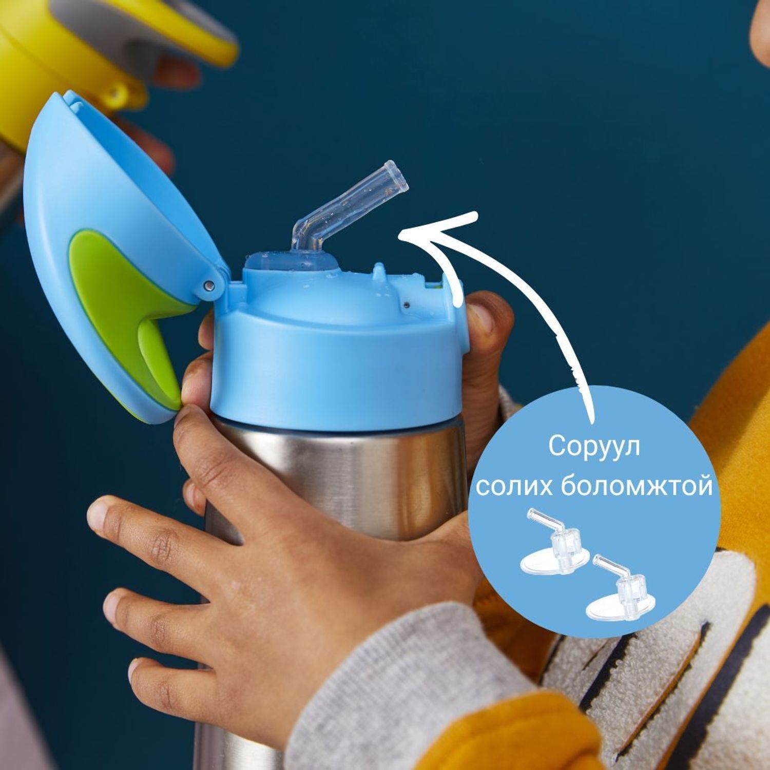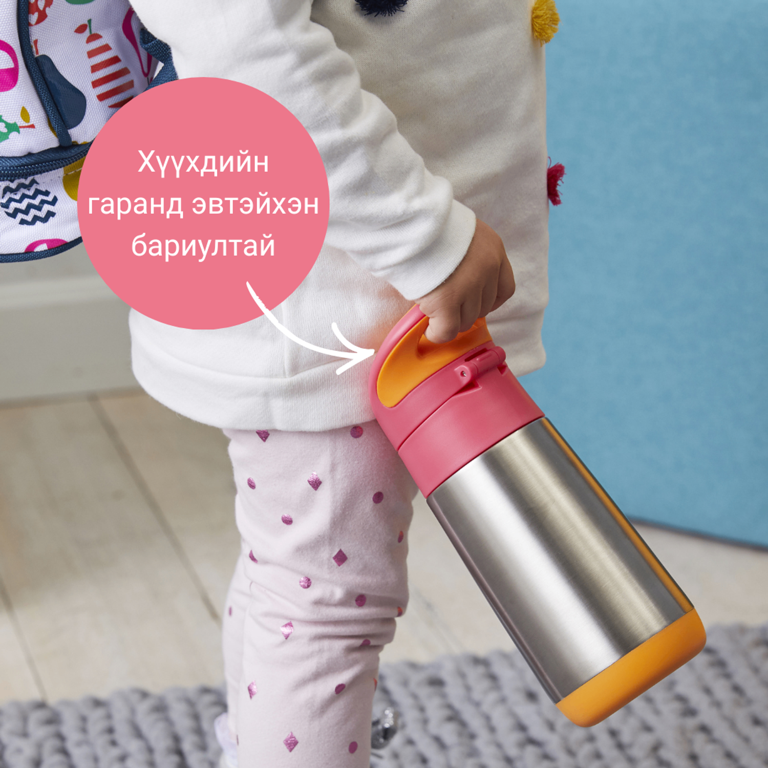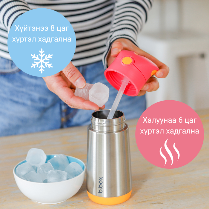 b.box брэндийн соруултай ган усны савны гурвалсан давхаргатай дулаан тусгаарлалт нь шингэнийг хамгийн тохиромжтой температурт хадгалах “супер” чадвартай! Силикон соруул нь уян зөөлөн тул хүүхдийн аманд эвтэйхэн, саадгүй уух боломж олгоно.